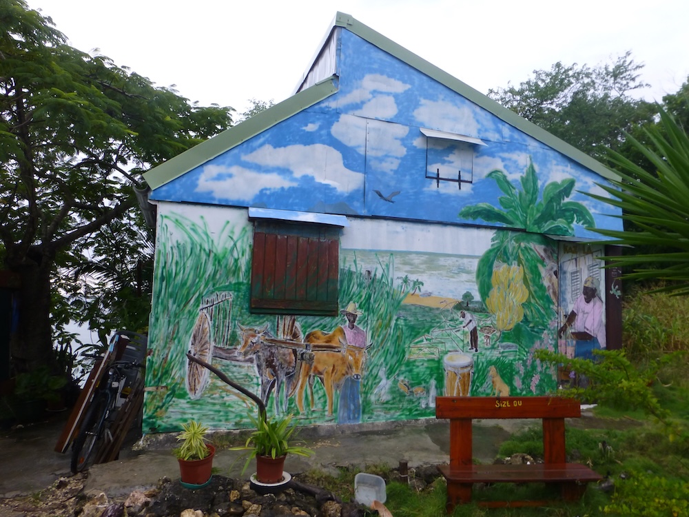 On ne peut pas la rater quand on passe devant  : la case est décorée comme un tableau naïf de l’île de la Dominique.