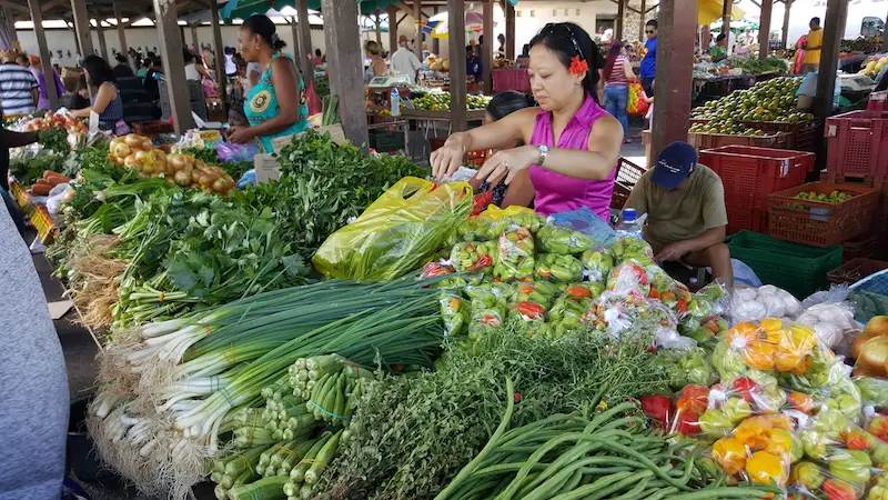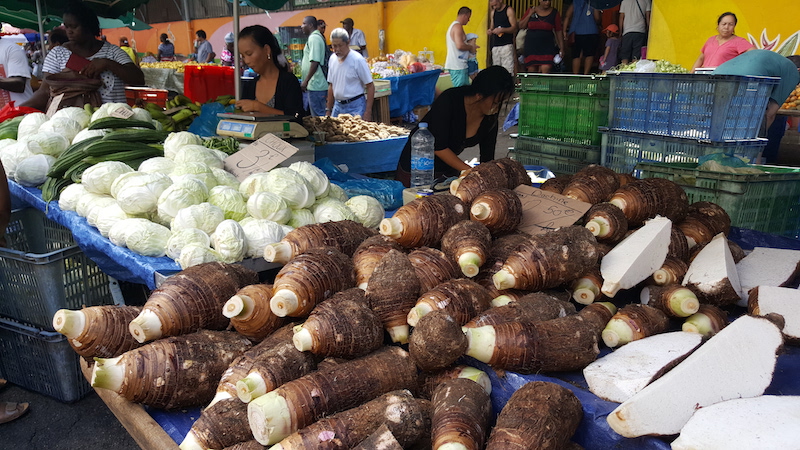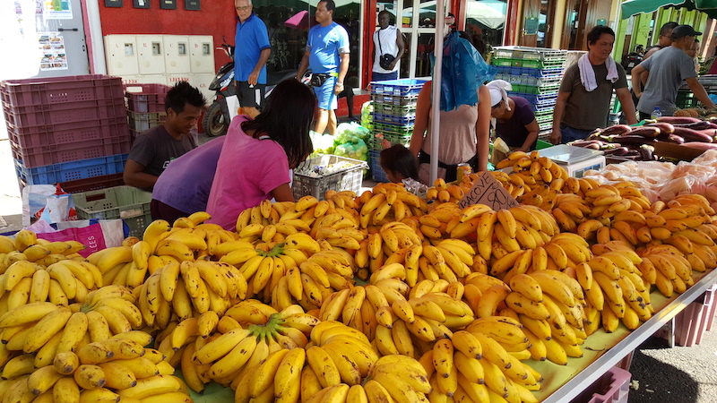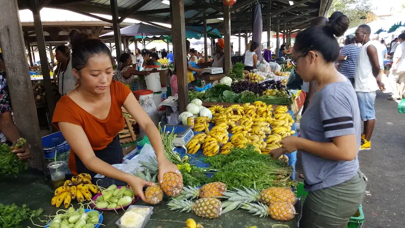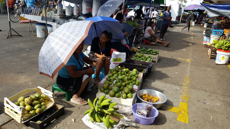 Le marché de Cayenne est un des plus réjouissants que j’aie vus. Il est relativement grand, très bien organisé, avec une halle couverte au centre. C’est un feu d’artifice multicolore de fruits, de légumes, d’épices. Le samedi matin il est très « achalandé » (ce qui veut dire que de nombreux « chalands » viennent acheter : chaland = client). Comme leurs clients, les marchands sont créoles, chinois, hmong, blancs . La bonne humeur règne. Au centre du marché couvert, on trouve des objets artisanaux, des souvenirs, des colliers de graines, et le fond du marché couvert est occupé par des échoppes de vendeurs de soupes chinoises, de nems, … que l’on peut manger sur place et assaisonner à sa guise.